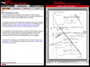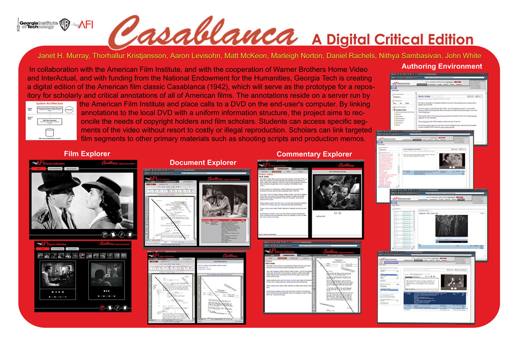 The Casablanca Digital Critical Edition was completed while I was a master’s student at Georgia Tech from 2004-2006 under the supervision of Prof. Janet Murray. Although somewhat dated now, this project was ahead of the its time, exploring web 2.0 concepts such as user generated content before they were popularized. The interface links DVD content to annotations and commentaries stored in an online server and enables home viewers of the 1942 film to access them while watching the film on DVD. The online user generated content can also be accessed through two alternate interfaces: a commentary explorer and a document explorer. By linking the web-based annotations to the local DVD with a uniform information structure the project reconciles the needs of copyright holders and film scholars. Students can access specific segments of the video without resorting to costly or illegal reproduction. Scholars can link targeted film segments to other primary materials such as shooting scripts, production memos, and never before seen outtakes. The Casablanca Digital Critical Edition was supported by the American Film Institute, Warner Brothers Home Video, InterActual, and with funding from the National Endowment for the Humanities.