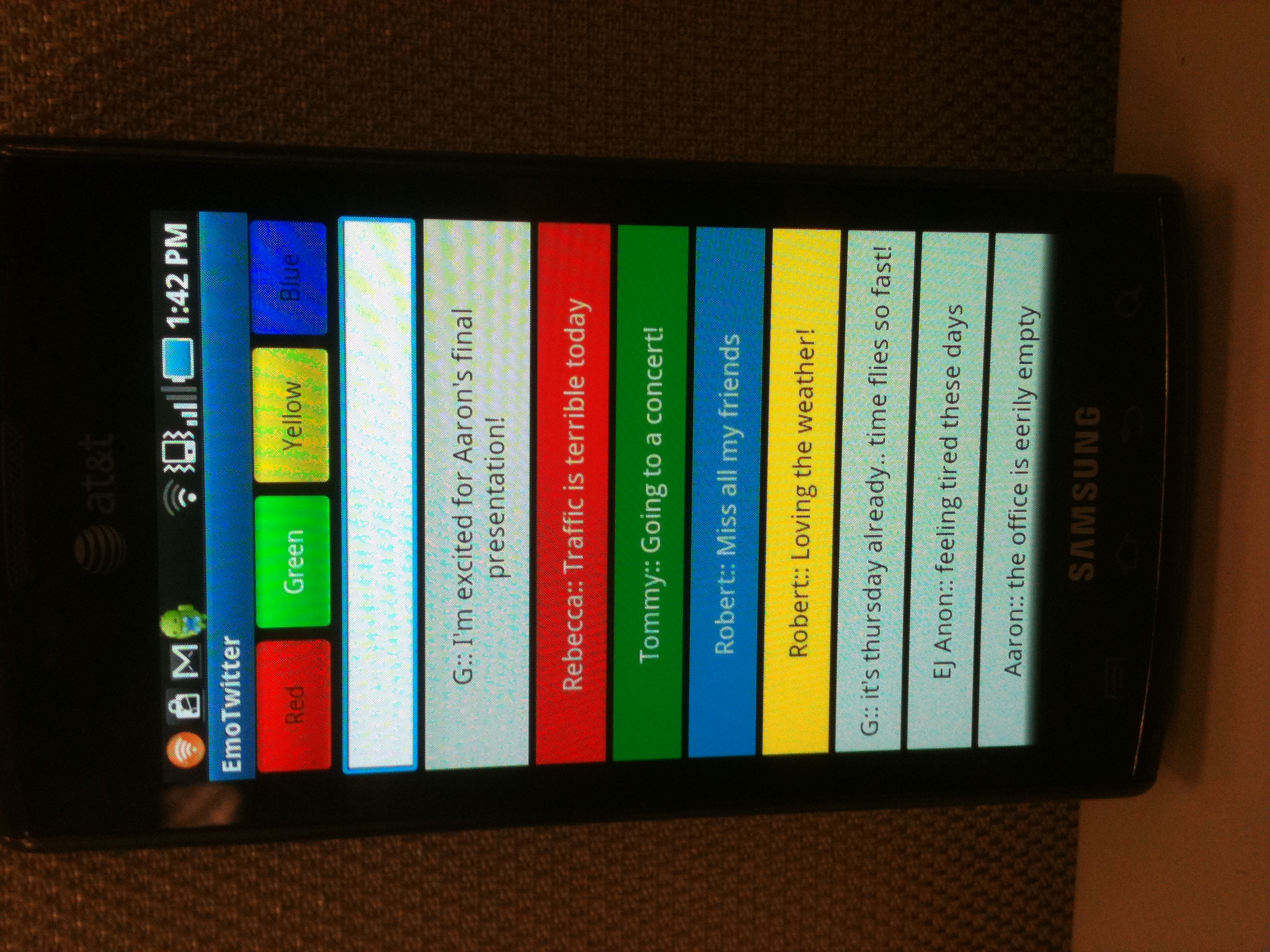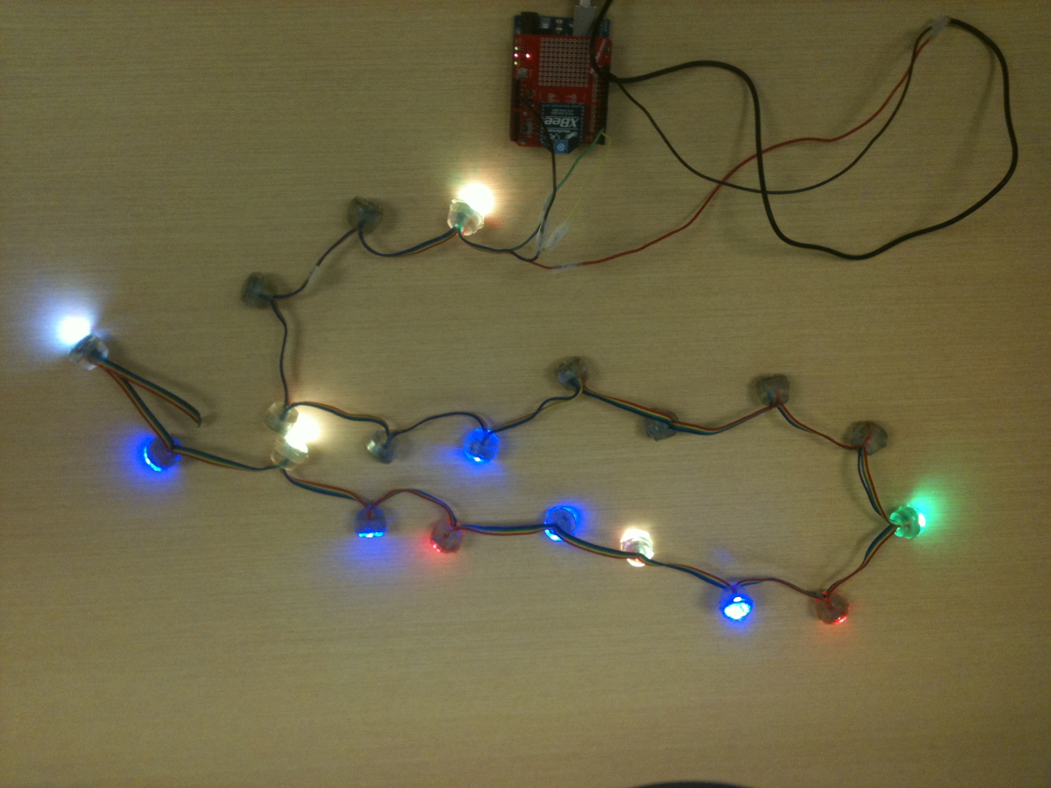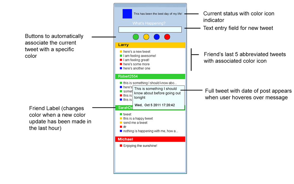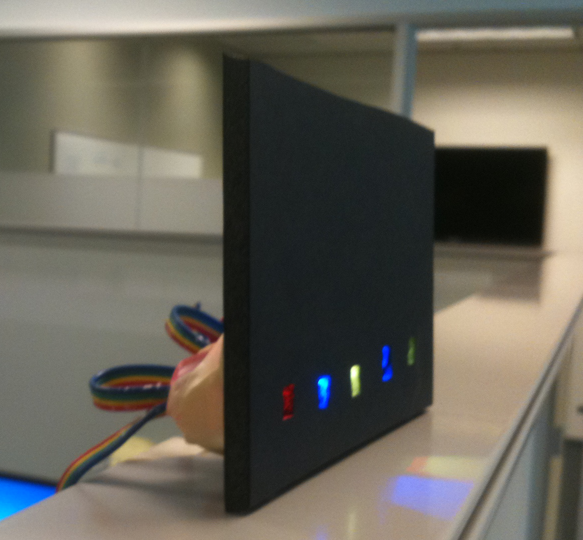 This project was developed for a client who was interested in a notification system that could provide ambient information about various online social networks. A chain of 20 Programmable LEDs were used to represent various information about four individuals simultaneously with five lights being assigned to each person. Each set of lights represent a friend’s status changes over time and could be used to represent emotion, availability, or an alternate attribute of choice. A demo desktop widget and Android applications were developed using Twitter to demonstrate the capabilities of the prototype. A study was carried out logging data for four individuals using the desktop widget to better understand real-world usage scenarios.