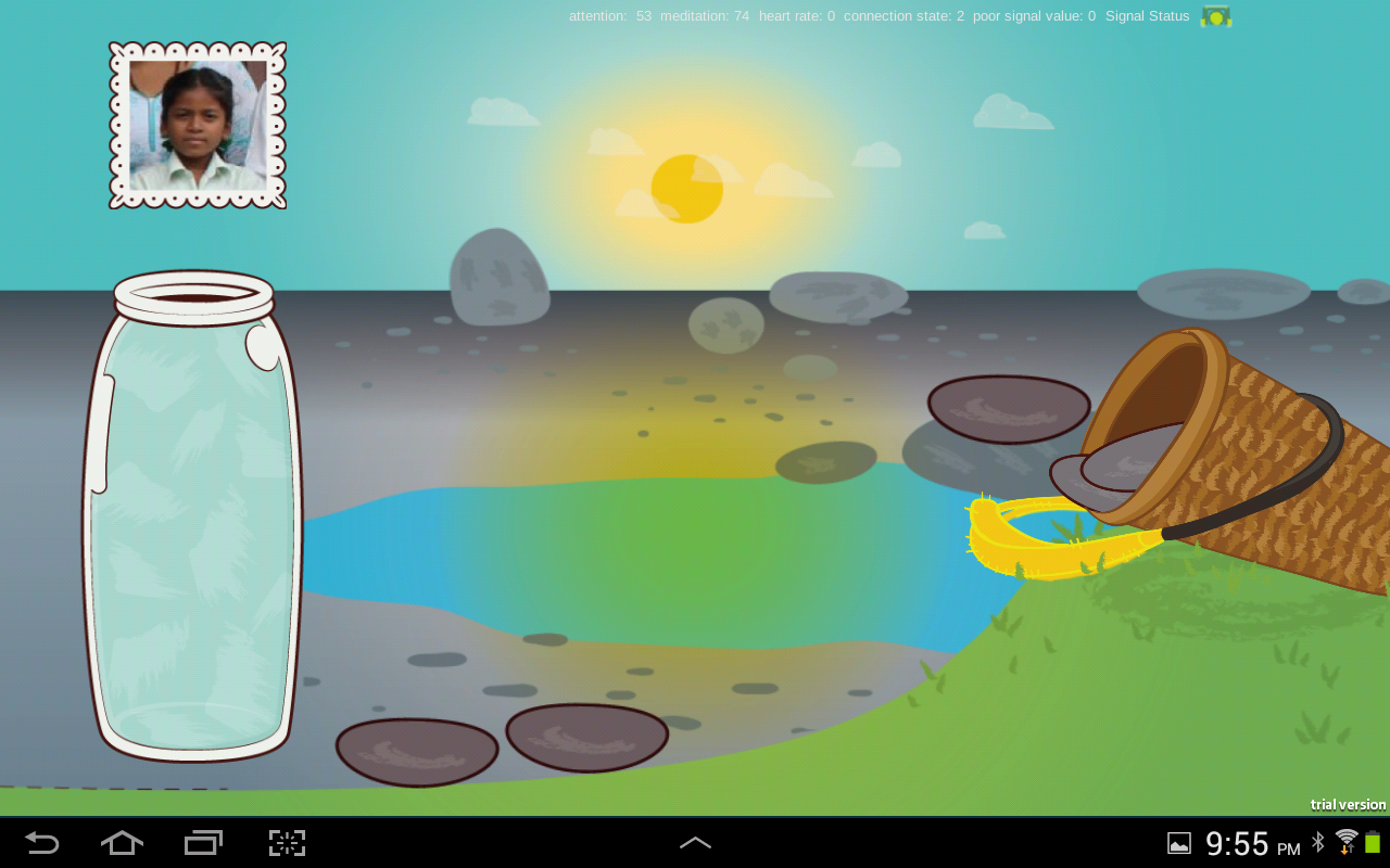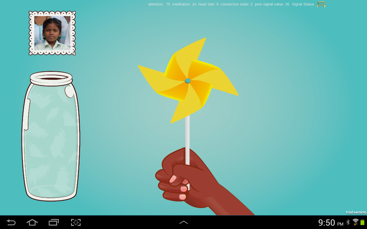 The Mind-Full Tablets Games project is comprised of a set of three games developed to assist young children in the development of affect-regulation skills. To help children learn and practice, and help the staff monitor their progress our team led by Alissa Antle, PhD developed a series of affect regulation games on an Android tablet controlled by neurofeedback. Neurofeedback training systems monitor a child’s brain wave state (e.g. alpha & beta waves) through a simple headset that contains sensing hardware. This data is used to control visual aspects in simple games, which provide visual feedback to the child about their brain (and body) state and motivation to change it. Each game is built around a physical game or activity in which the child has to moderate their body state to play. In this way children immediately know how to play the digital version. For example, to cause a pinwheel to spin on the tablet screen, a child can breathe deeply and blow out gently to move their mind and body into a relaxed state, which in turn cause the digital pinwheel to spin. Using simple, familiar games implemented on a tablet motivates children to repetitively practice, which improves their ability to self-regulate. So far, we have built games to improve relaxation (decrease anxiety) and to improve focused attention.